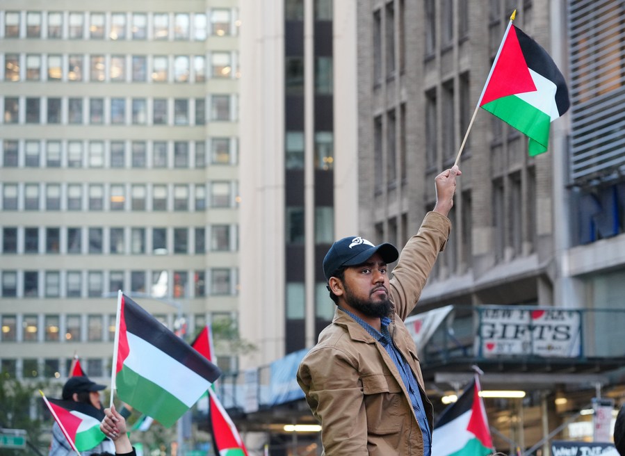 Protesters gather during a rally amid the escalating conflict between Israel and Hamas in New York, United States, Oct. 13, 2023. (Photo by Winston Zhou/Xinhua)