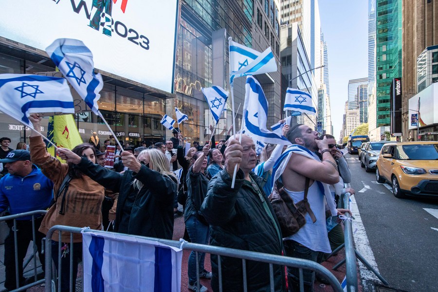 Protesters gather during a rally amid the escalating conflict between Israel and Hamas in New York, United States, Oct. 13, 2023. (Photo by Nick Starichenko/Xinhua)
