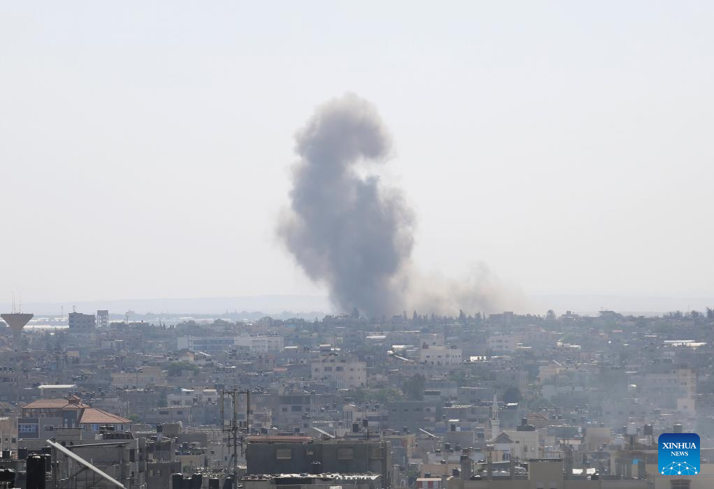 (231015) -- GAZA, Oct. 15, 2023 (Xinhua) -- This photo taken on Oct. 15, 2023 shows smoke rising following an Israeli airstrike in the southern Gaza Strip city of Rafah. The number of Palestinian casualties in Gaza reached 2,329 deaths and 9,042 injuries on Sunday, said the Gaza-based Palestinian Health Ministry on the ninth day of the Israel-Hamas conflict. (Photo by Khaled Omar/Xinhua)