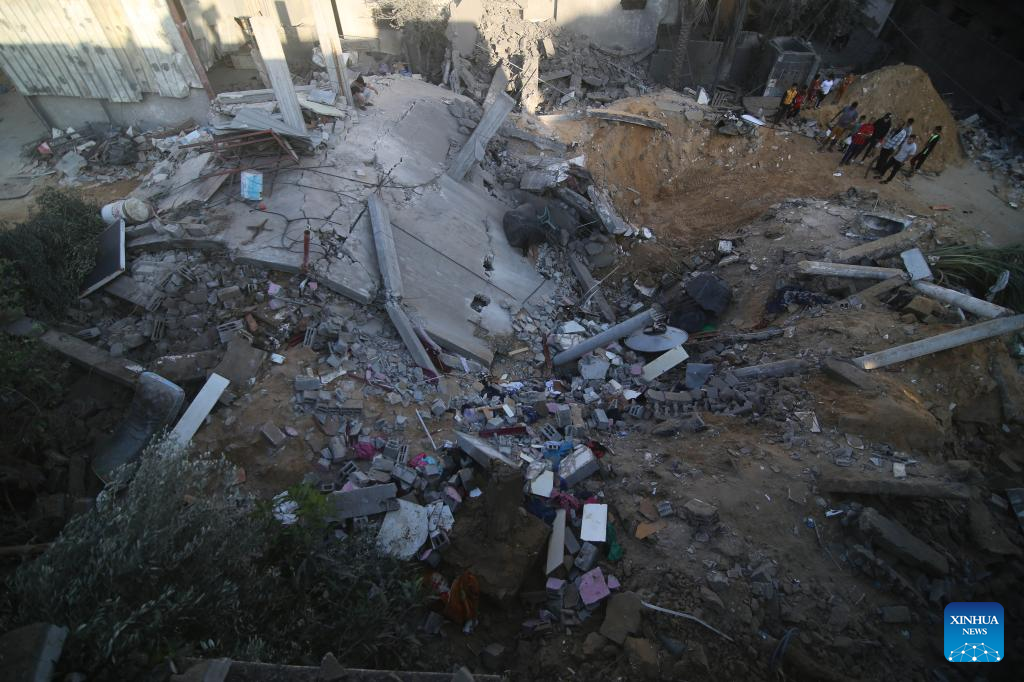 (231015) -- GAZA, Oct. 15, 2023 (Xinhua) -- People inspect buildings destroyed in Israeli airstrikes in the southern Gaza Strip city of Rafah, Oct. 15, 2023. The number of Palestinian casualties in Gaza reached 2,329 deaths and 9,042 injuries on Sunday, said the Gaza-based Palestinian Health Ministry on the ninth day of the Israel-Hamas conflict. (Photo by Khaled Omar/Xinhua)