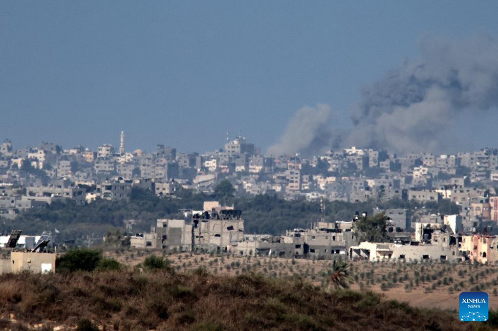 This photo taken on Oct. 15, 2023 from the Israeli side near the Israel-Gaza border shows smoke billowing after an Israeli airstrike in the Gaza Strip. The number of Palestinian casualties in Gaza reached 2,329 deaths and 9,042 injuries on Sunday, said the Gaza-based Palestinian Health Ministry on the ninth day of the Israel-Hamas conflict. (Ilan Assayag/JINI via Xinhua)