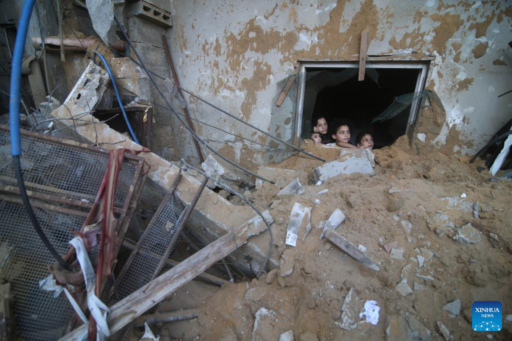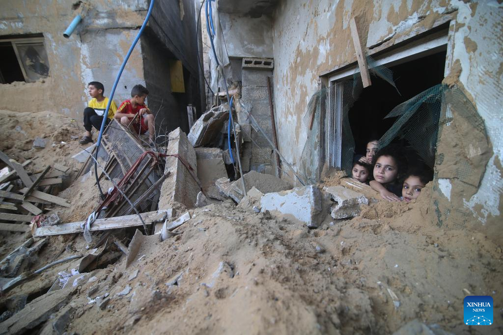(231015) -- GAZA, Oct. 15, 2023 (Xinhua) -- Children are seen in buildings damaged in Israeli airstrikes in the southern Gaza Strip city of Rafah, Oct. 15, 2023. The number of Palestinian casualties in Gaza reached 2,329 deaths and 9,042 injuries on Sunday, said the Gaza-based Palestinian Health Ministry on the ninth day of the Israel-Hamas conflict. (Photo by Khaled Omar/Xinhua)