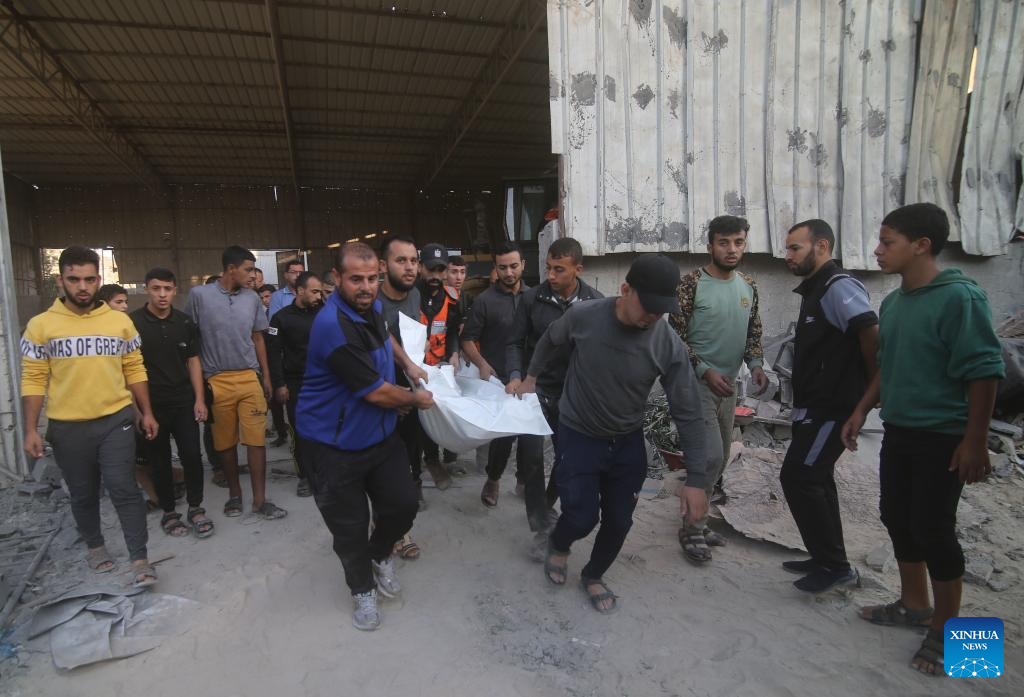 (231015) -- GAZA, Oct. 15, 2023 (Xinhua) -- People remove the body of a victim from a building destroyed in Israeli airstrikes in the southern Gaza Strip city of Rafah, Oct. 15, 2023. The number of Palestinian casualties in Gaza reached 2,329 deaths and 9,042 injuries on Sunday, said the Gaza-based Palestinian Health Ministry on the ninth day of the Israel-Hamas conflict. (Photo by Khaled Omar/Xinhua)