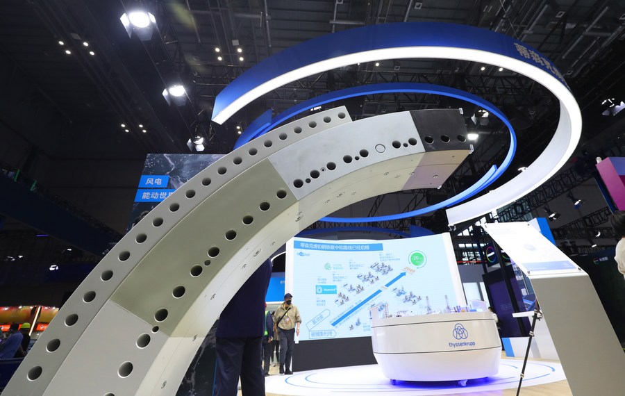 This photo taken on Nov. 2, 2022 shows the exhibition booth of Thyssenkrupp AG, a German steel producer company, in the main venue of the upcoming fifth China International Import Expo (CIIE) in east China's Shanghai. (Xinhua/Fang Zhe)