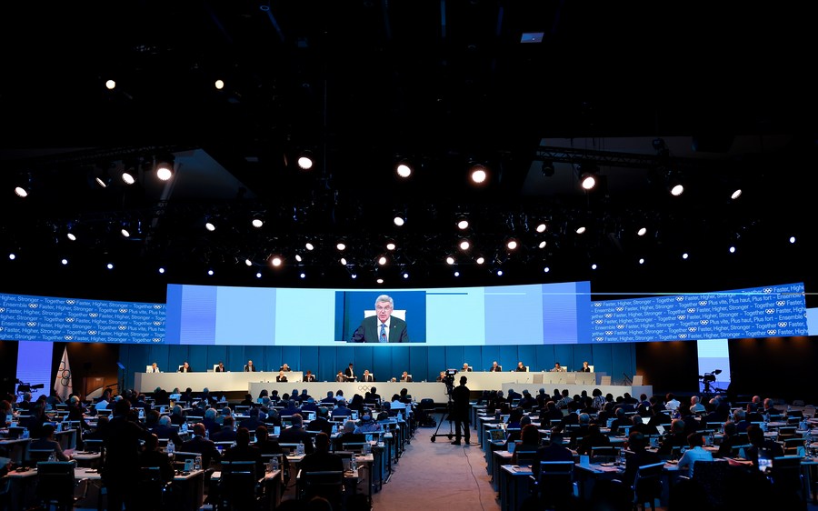 The photo taken on Oct. 15, 2023 shows the 141st International Olympic Committee (IOC) session in Mumbai, India. (Xinhua/Cao Can)