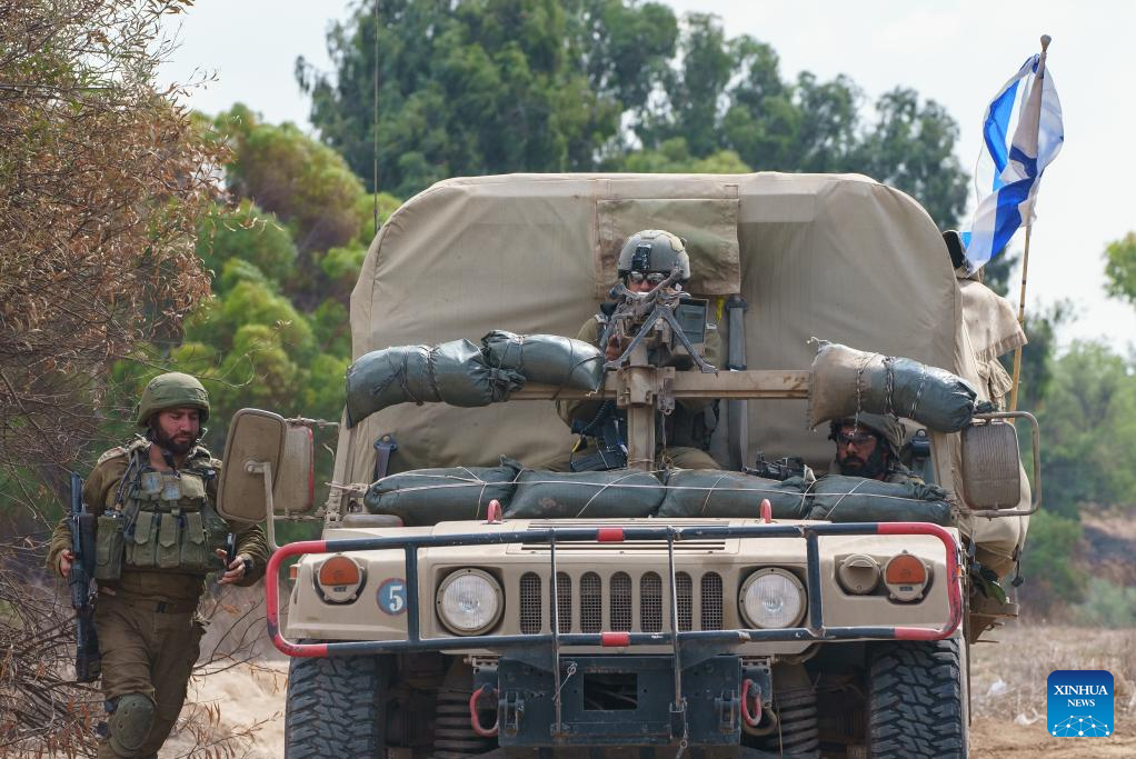 A vehicle of Israeli military patrols near the Israel-Gaza border, Oct. 15, 2023. Israel on Sunday continued its preparations for a massive ground operation in Gaza, mobilizing forces near the Gaza border, as its bloody conflict with the Palestinian Islamic Resistance Movement (Hamas) entered the second week. (Xinhua/Chen Junqing)
