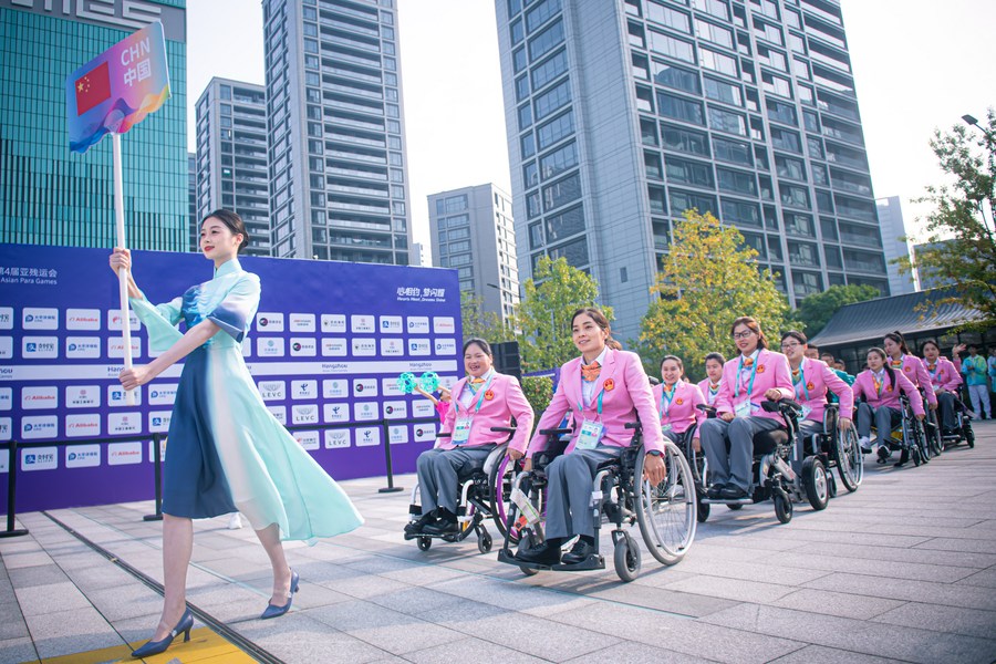 Members of Chinese Sports delegation arrive at the opening ceremony for the 4th Asian Para Games Village and team welcome ceremony for the Chinese Sports Delegation in Hangzhou, east China's Zhejiang Province, Oct. 16, 2023.