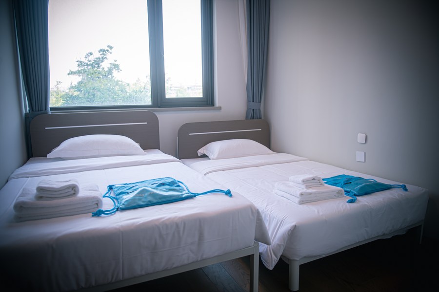 Photo taken on Oct. 16, 2023 shows a barrier-free bed on the right and an accompany bed on the left in the 4th Asian Para Games Village in Hangzhou, east China's Zhejiang Province.