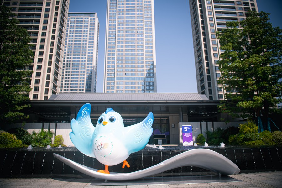 A sculpture of the mascot of the 4th Asian Para Games is seen in the 4th Asian Para Games Village in Hangzhou, east China's Zhejiang Province, Oct. 16, 2023.