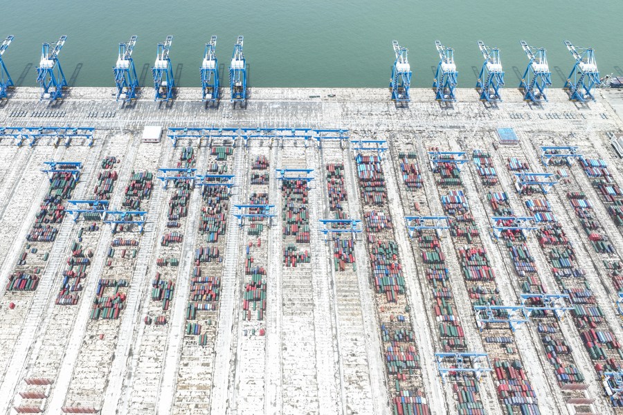 This aerial photo taken on July 22, 2023 shows an automated container wharf of the Beibu Gulf Port in Qinzhou, south China's Guangxi Zhuang Autonomous Region. (Xinhua/Cao Yiming)