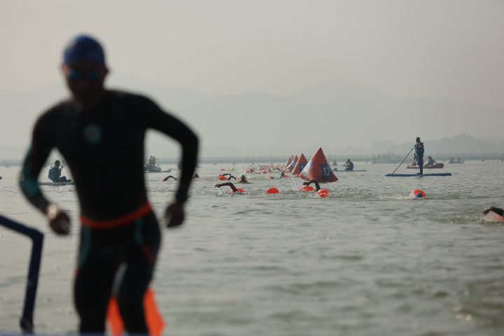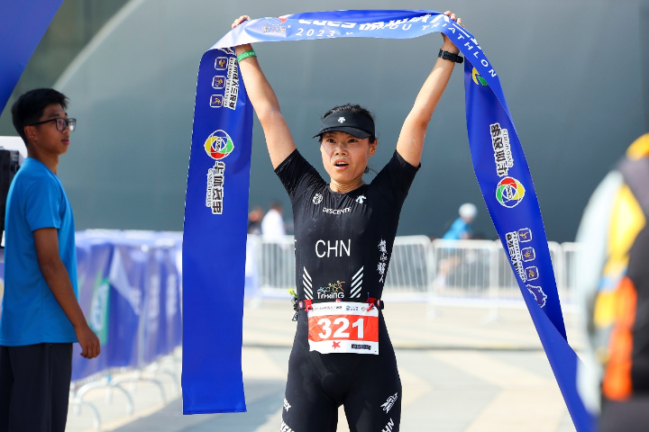 Miao completed 1,500m swim, 40km cycling and 10km run in one hour, 58 minutes and 15 seconds, followed by Li Chen who clocked 1:59:52.