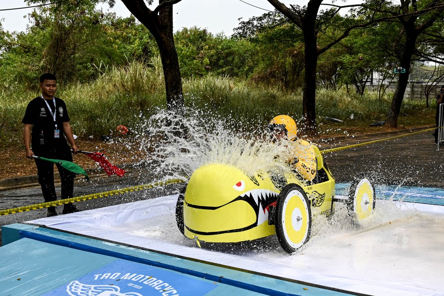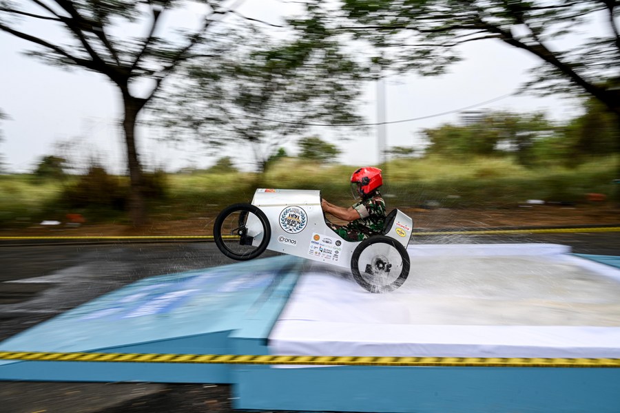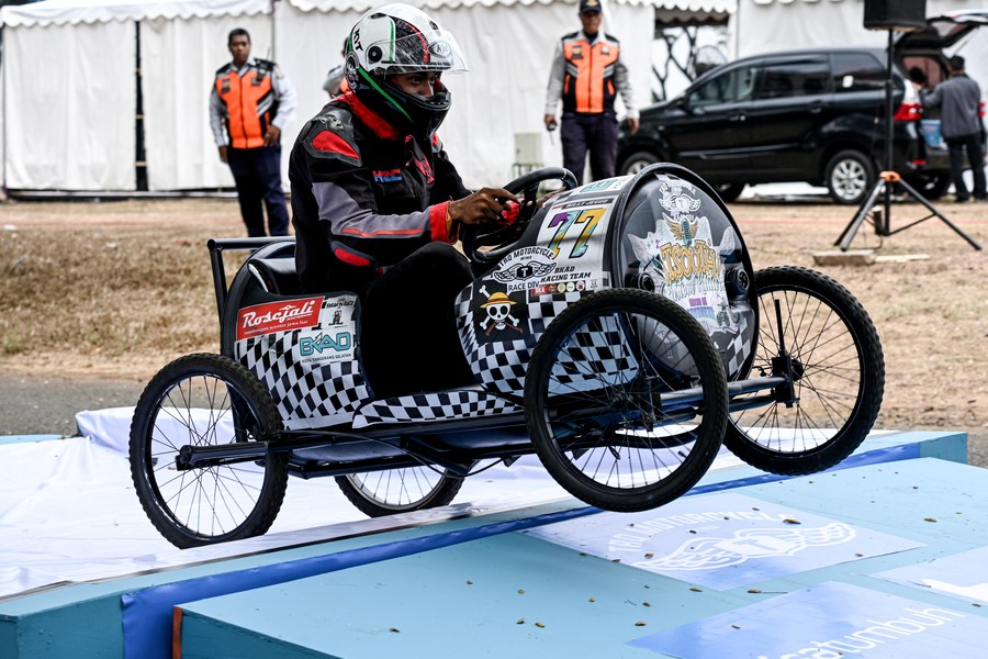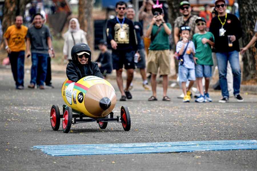 A man drives a non-motorized hand-made vehicle during the South Tangerang SoapBox Freaking Race 2023 in Banten province, Indonesia, on Oct. 15, 2023. (Photo by Agung Kuncahya B./Xinhua)