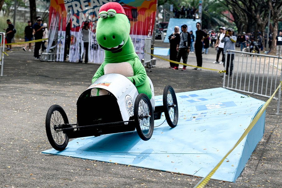 A man wearing dinosaur costumes drives a non-motorized hand-made vehicle in speed category during the South Tangerang SoapBox Freaking Race 2023 in Banten Province, Indonesia, on Oct. 15, 2023. (Photo by Agung Kuncahya B./Xinhua)