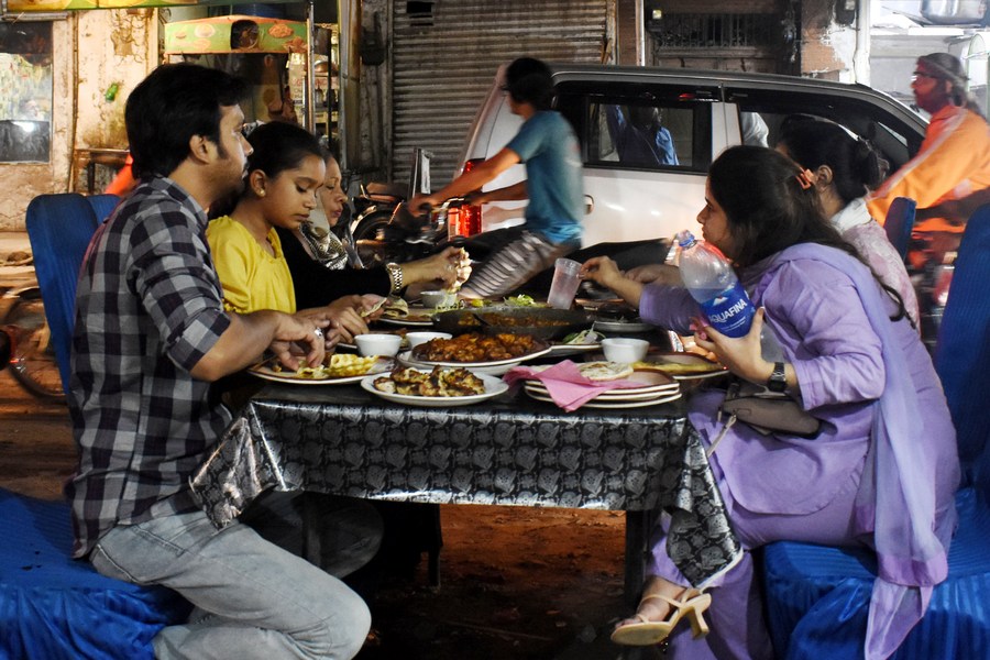 People enjoy food by the street in Lahore, Pakistan, Oct. 15, 2023. (Photo by Sajjad/Xinhua)