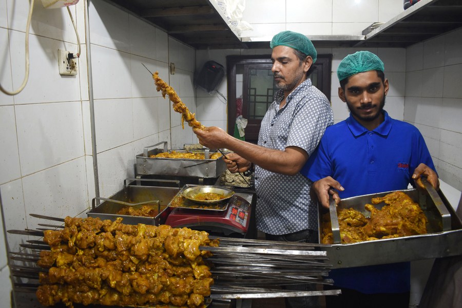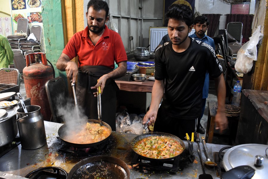 Chefs prepare food at a restaurant in Lahore, Pakistan on Oct. 15, 2023. (Photo by Sajjad/Xinhua)