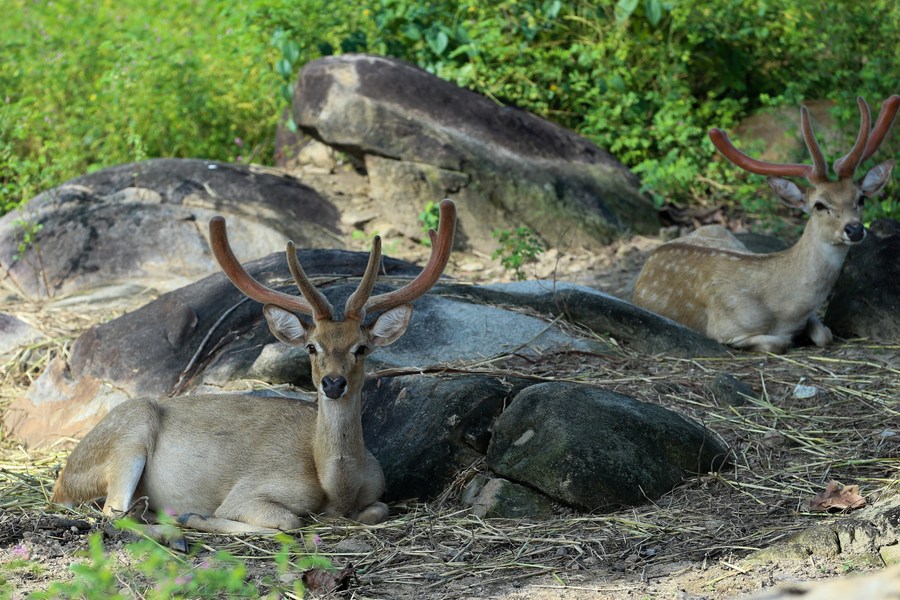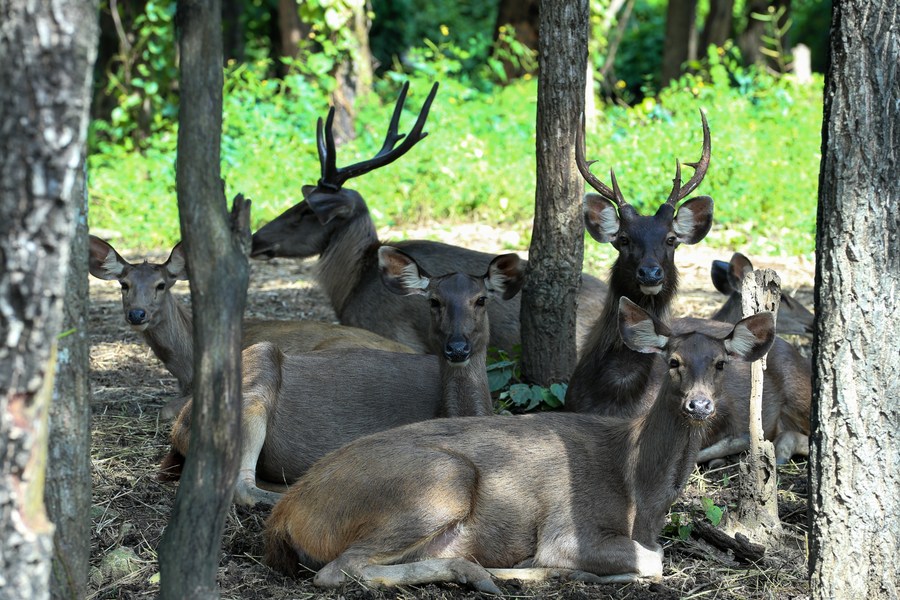 Eld's deers are seen at the Safari Park in Nay Pyi Taw, Myanmar, Oct. 16, 2023. (Photo by Myo Kyaw Soe/Xinhua)