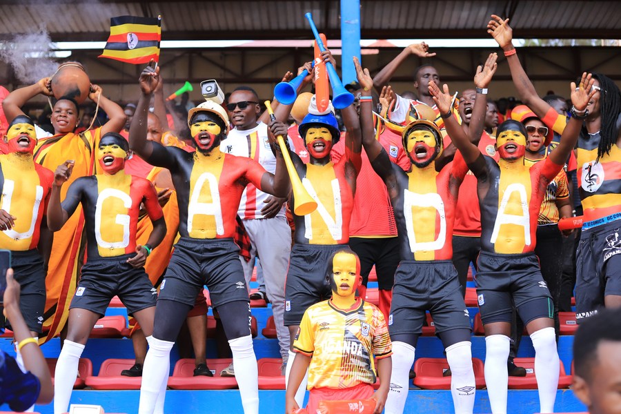 Fans of Uganda cheer for the team during the Africa Cup of Nations (AFCON) qualifier group F match between Uganda and Niger in Kitende, Wakiso District, Uganda, on June 8, 2022. (Xinhua/Photo by Hajarah Nalwadda)