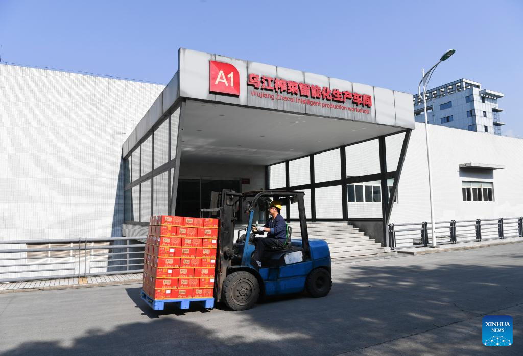 Employees work in an intelligent production workshop of Chongqing Fuling Zhacai Group Co., Ltd. in southwest China's Chongqing Municipality, Oct. 16, 2023. The history of pickle-making in Chongqing's Fuling, a major pickle production base, dates back more than 150 years. The district's traditional method of producing preserved mustard tubers was listed as a state-level intangible cultural heritage in 2008.
