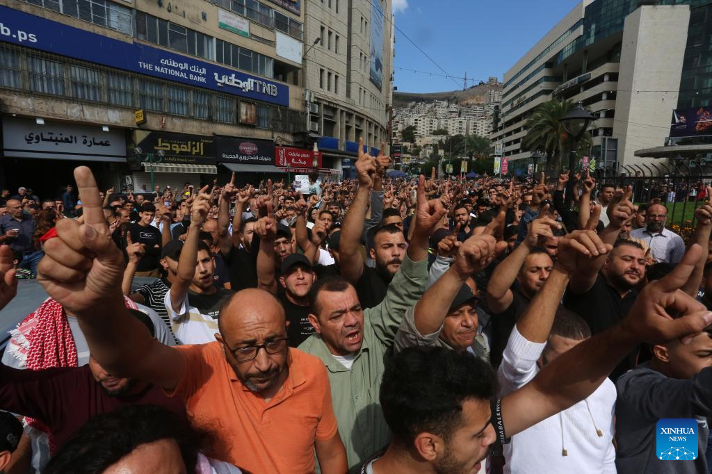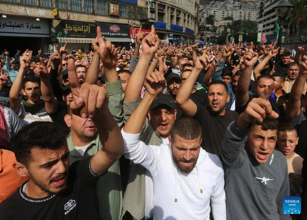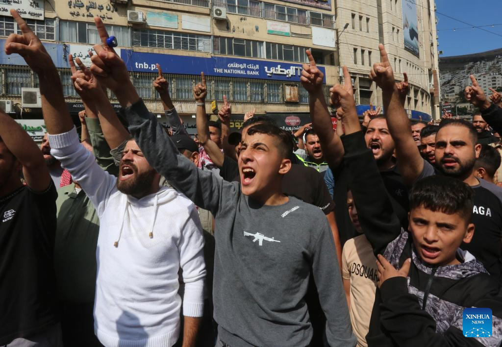 Palestinians protest against an airstrike on the Al-Ahli Arabi Baptist Hospital in the West Bank city of Nablus, Oct. 18, 2023.