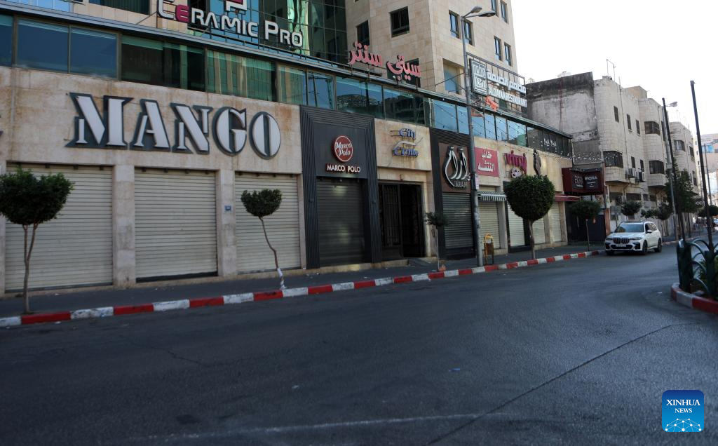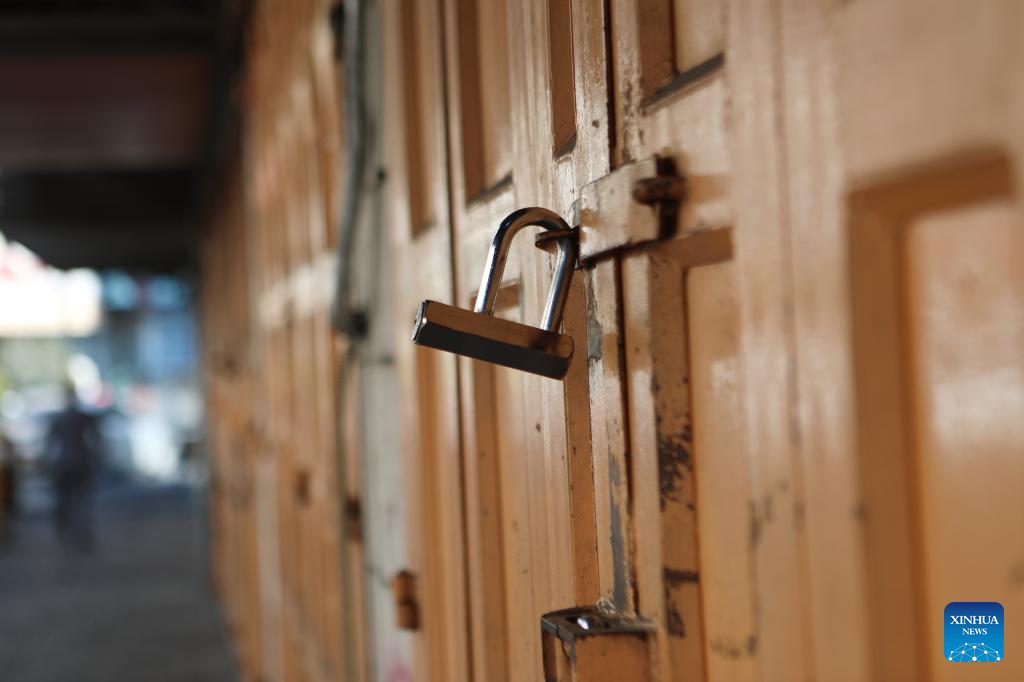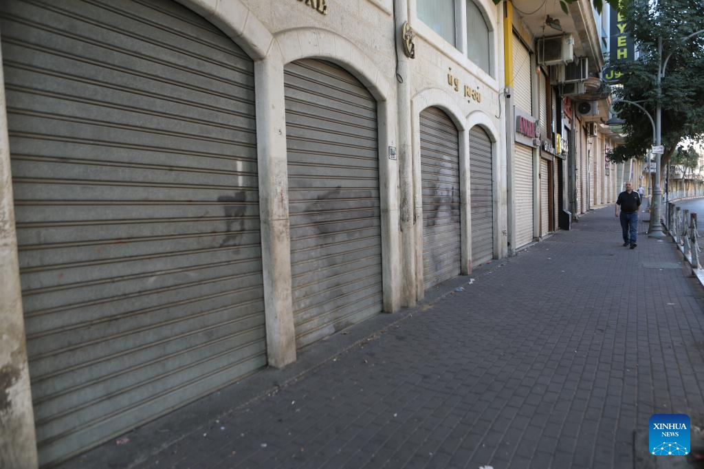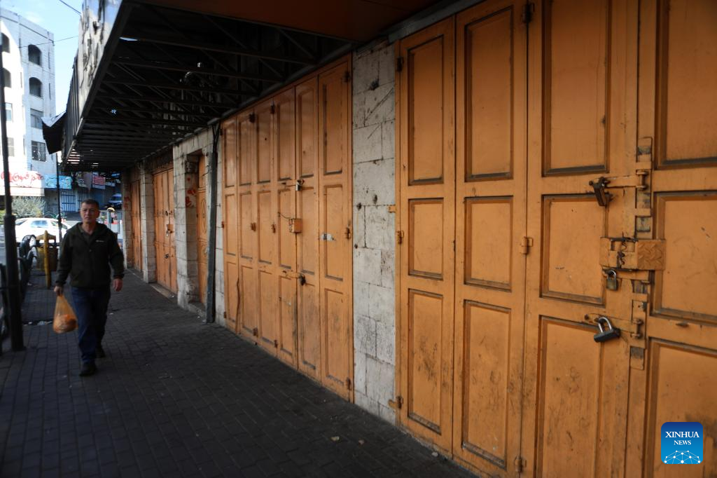 (231018) -- HEBRON, Oct. 18, 2023 (Xinhua) -- Shops are seen closed during a strike to protest against an airstrike on the Al-Ahli Arabi Baptist Hospital in the West Bank city of Hebron, on Oct. 18, 2023. At least 471 Palestinians were killed in a blast on the Al-Ahli Arabi Baptist Hospital in the Gaza Strip on Tuesday night, said the Gaza-based Health Ministry on Wednesday.