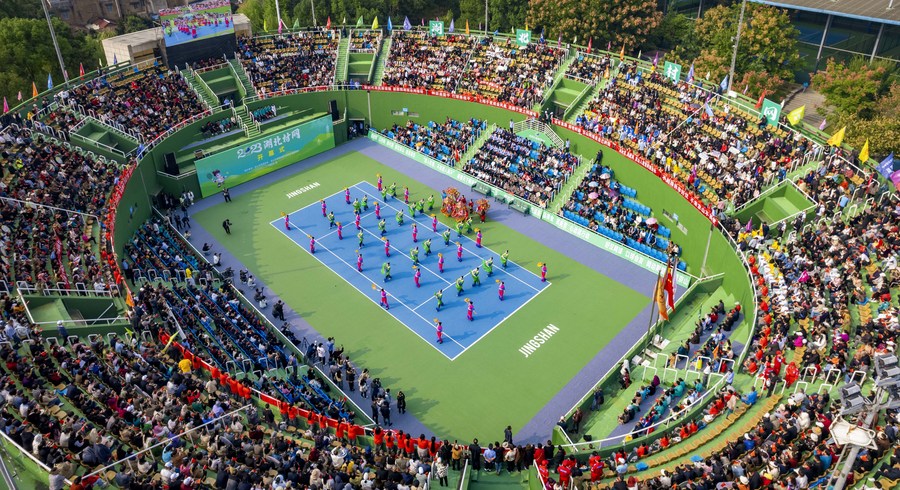 This photo taken on Oct. 13, 2023 shows the opening ceremony of the inaugural Village Tennis Competition in central China's Hubei Province. (Photo by Zhang Wensheng/Xinhua)