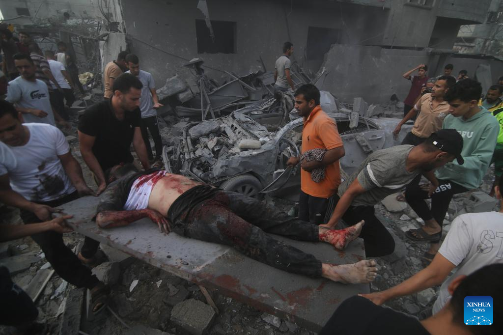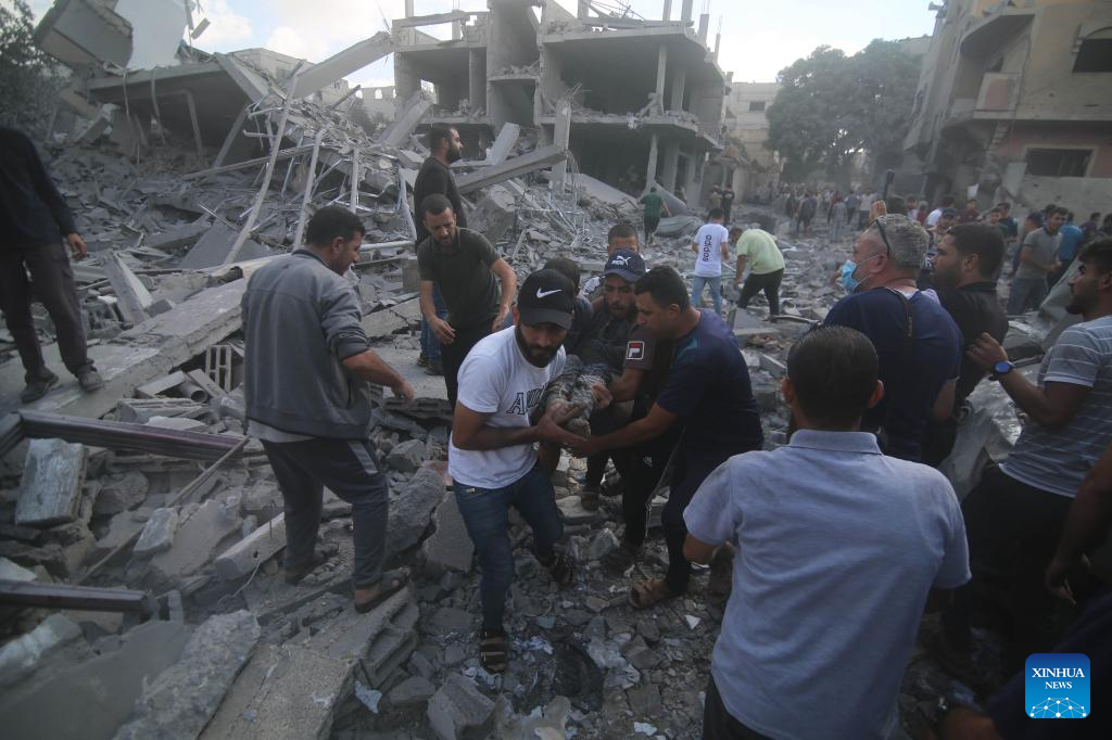 People remove a victim from a building destroyed in Israeli airstrikes in the southern Gaza Strip city of Rafah, on Oct. 17, 2023. The number of Palestinian deaths caused by Israeli airstrikes in Gaza has risen to 3,000, according to the Gaza-based Health Ministry. The Israeli airstrikes were triggered by a large-scale Hamas attack on Israeli military targets and towns on Oct. 7, which has so far killed at least 1,300 people in Israel. (Photo by Khaled Omar/Xinhua)
