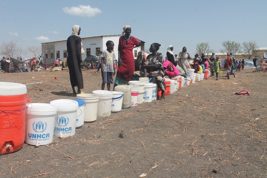 Displaced South Sudanese women queue for water at the reception center in Renk County, Upper Nile State, South Sudan, on April 30, 2023. (Photo by Denis Elamu/Xinhua)