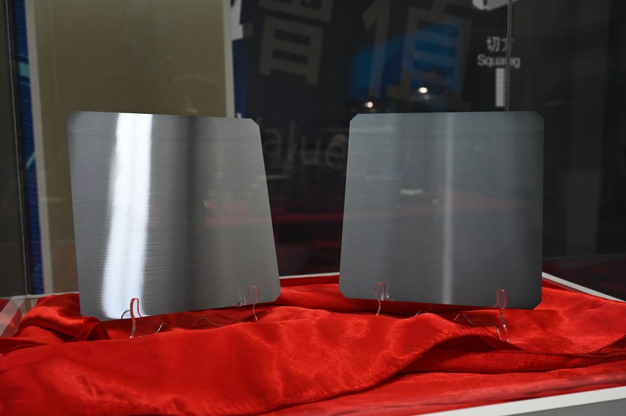 Photo taken on Oct. 17, 2023 shows products of LONGi Green Energy Technology Co., Ltd., a leading enterprise in the solar photo-voltaic (PV) industry in China, at its new plant launched in Selangor state of Malaysia. (Photo by Cheng Yiheng/Xinhua)