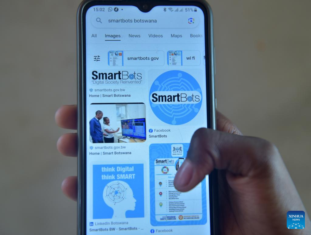 A person browses the internet with a smartphone in Gaborone, Botswana, on Oct. 18, 2023. Botswanan President Mokgweetsi Masisi on Wednesday launched the SmartBots Village Connectivity project, designed to accelerate digital transformation across the southern African country. (Photo by Tshekiso Tebalo/Xinhua)