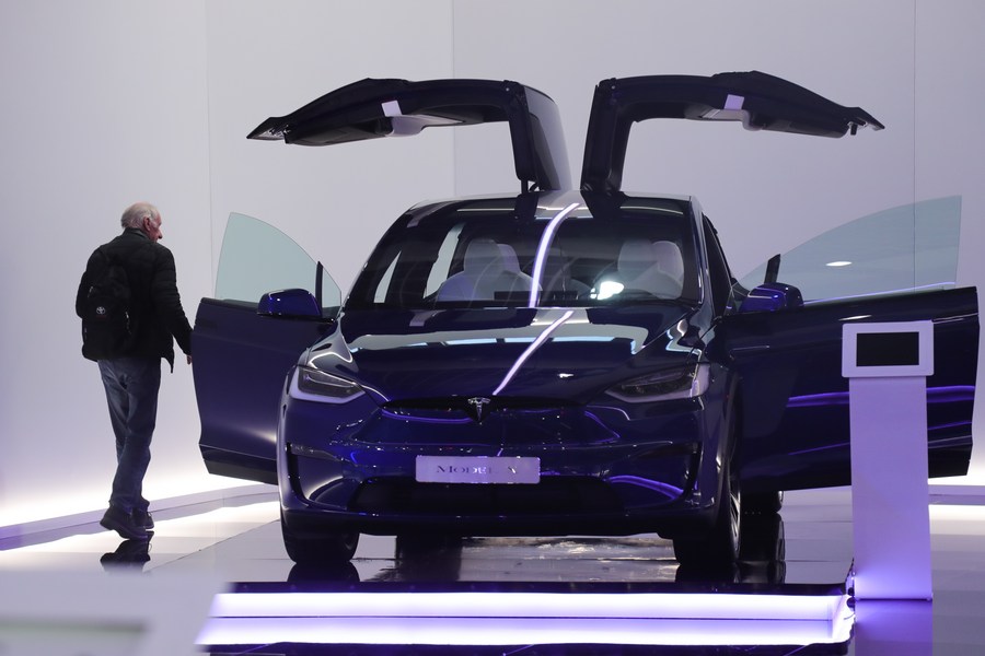 A man looks at a Tesla Model X during the press day of the 100th Brussels Motor Show in Brussels, Belgium, Jan. 13, 2023. (Xinhua/Zheng Huansong)