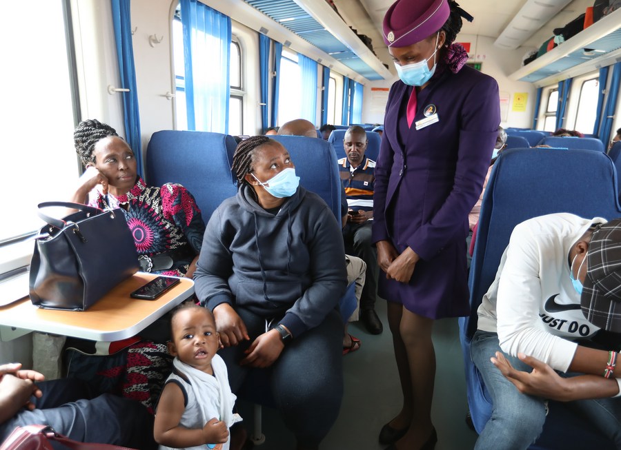 KTrain crew Fionah communicates with passengers on a Mombasa-Nairobi Railway passenger train, July 29, 2022. (Xinhua/Dong Jianghui)