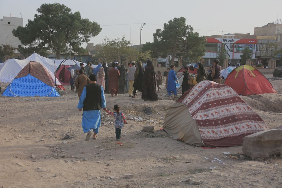 People are seen near tents on the open ground for fear of tremors in Herat City, west Afghanistan's Herat Province, Oct. 15, 2023. (Photo by Saifurahman Safi/Xinhua)