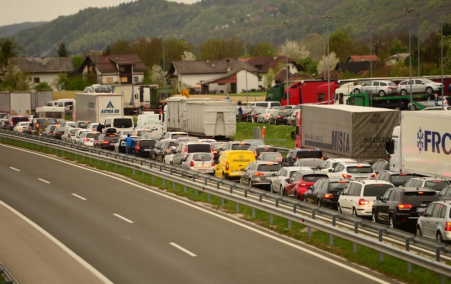 Vehicle wait in queues in Obrezje, one of the main border crossings connecting capitals of Slovenia and Croatia, in Slovenia, on April 7, 2017. Travellers witnessed extended queues at the border controls between Slovenia and Croatia on Friday, the first day that stricter border checks on the outer border of the Schengen area is introduced. (Xinhu/Matic Stojs)