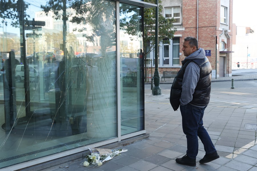 A man checks the bullet hole of Monday evening's shooting in Brussels, Belgium, Oct. 17, 2023. Belgium's Federal Prosecutor's Office confirmed on Tuesday that the suspect in Monday evening's shooting in Brussels that resulted in two deaths and one injury has been identified and is deceased. (Xinhua/Zhao Dingzhe)