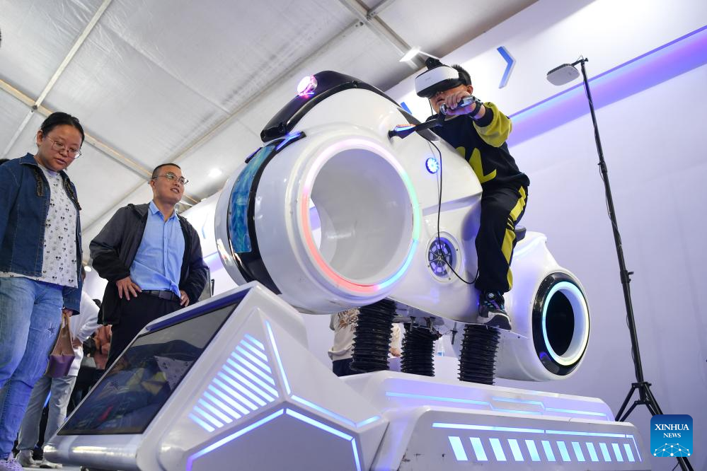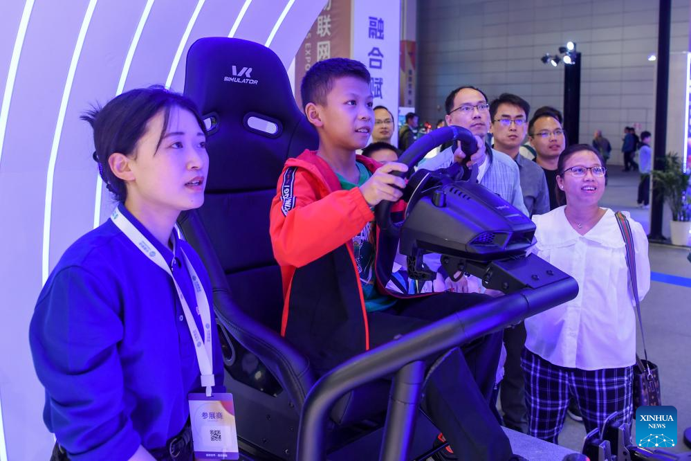 A kid experiences an intelligent entertainment equipment at the 2023 World Internet of Things (IoT) Exposition in Wuxi, east China's Jiangsu Province, Oct. 21, 2023.