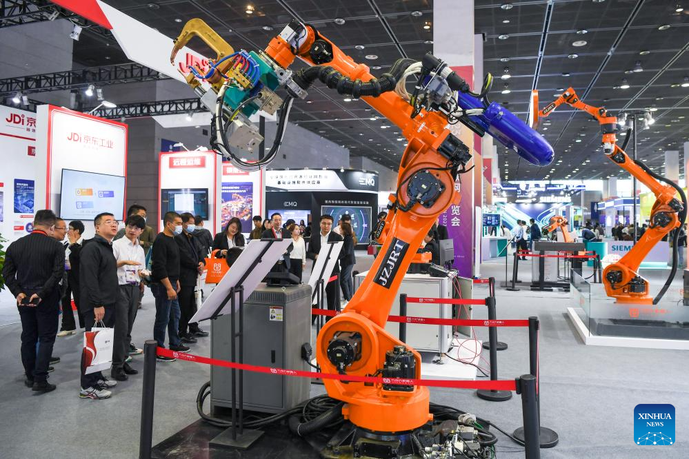 This photo taken on Oct. 21, 2023 shows a working station for intelligent robots at the 2023 World Internet of Things (IoT) Exposition in Wuxi, east China's Jiangsu Province.