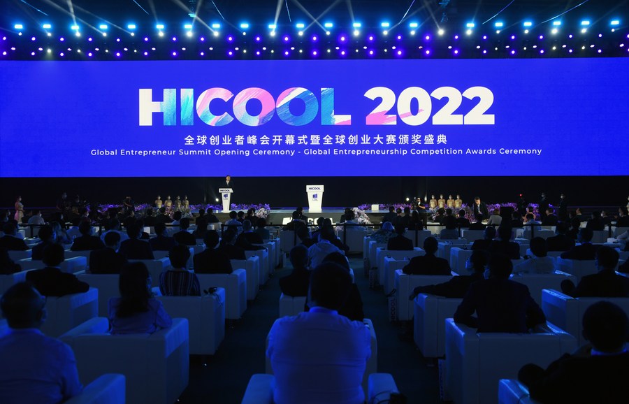 Photo taken on Aug. 26, 2022 shows the HICOOL 2022 Global Entrepreneur Summit Opening Ceremony and Global Entrepreneurship Competition Awards Ceremony at the new venue of China International Exhibition Center in Beijing, capital of China. (Xinhua/Ren Chao)