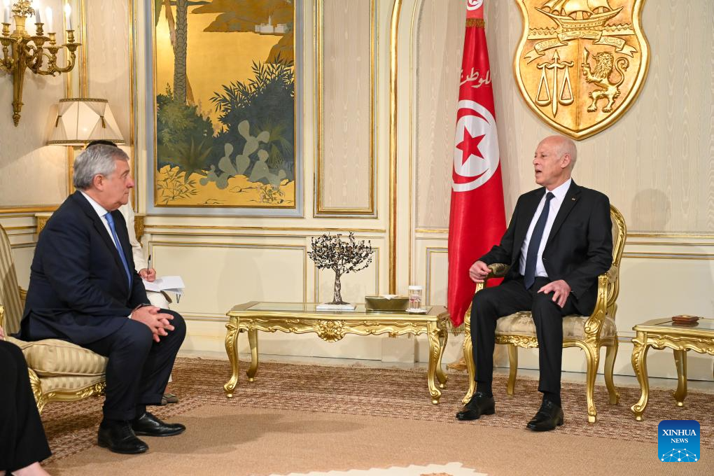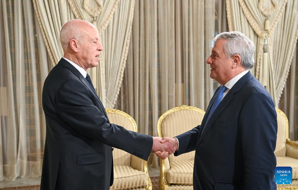 Tunisian President Kais Saied (R) meets with Italian Deputy Prime Minister and Minister of Foreign Affairs Antonio Tajani in Tunis, Tunisia, on Oct. 20, 2023. (Tunisian Presidency/Handout via Xinhua)