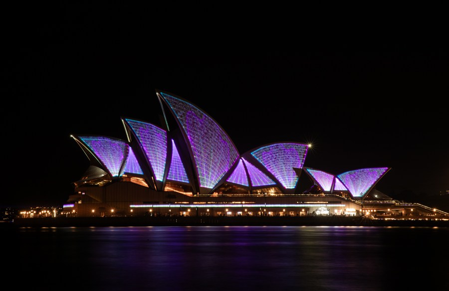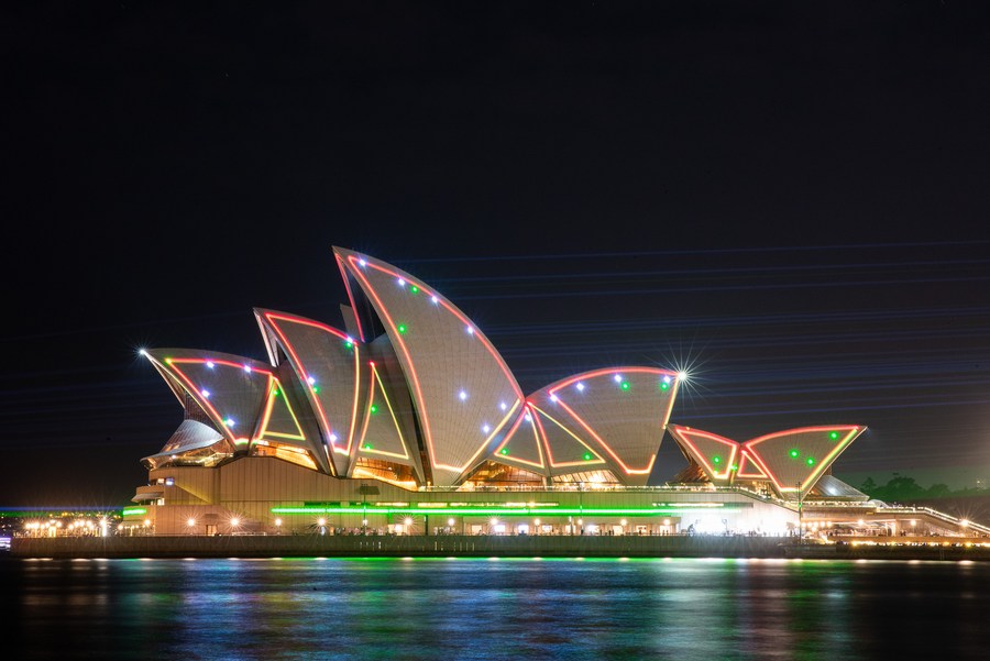 Sydney Opera House is lit up for its 50th birthday in Sydney, Australia, Oct. 20, 2023. (Photo by Hu Jingchen/Xinhua)