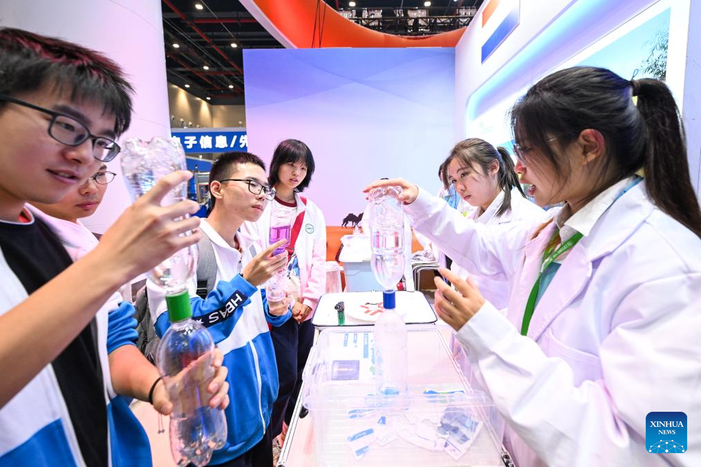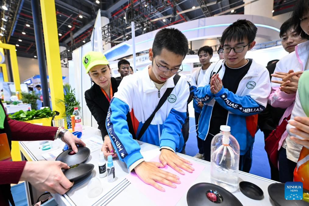 Students interact with staff members at the stand of the Netherlands during the first Donghu Forum in Wuhan, central China's Hubei Province, Oct. 20, 2023. The first Donghu Forum kicked off on Friday in Wuhan. The three-day forum showcases domestic and foreign achievements in science popularization and scientific innovation. Exhibitors from Belt and Road Initiative (BRI) partner countries bring the public various science shows during the forum. (Xinhua/Xiao Yijiu)