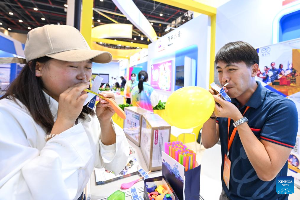 A student interacts with a staff member at the stand of Thailand during the first Donghu Forum in Wuhan, central China's Hubei Province, Oct. 20, 2023. The first Donghu Forum kicked off on Friday in Wuhan. The three-day forum showcases domestic and foreign achievements in science popularization and scientific innovation. Exhibitors from Belt and Road Initiative (BRI) partner countries bring the public various science shows during the forum. (Xinhua/Xiao Yijiu)