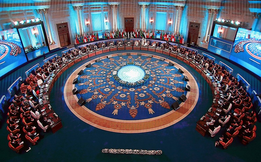 The screen shows the conference hall of the Cairo Peace Summit held at Egypt's new administrative capital east of Cairo, Egypt, Oct. 21, 2023. (Photo by Wang Dongzhen/Xinhua)