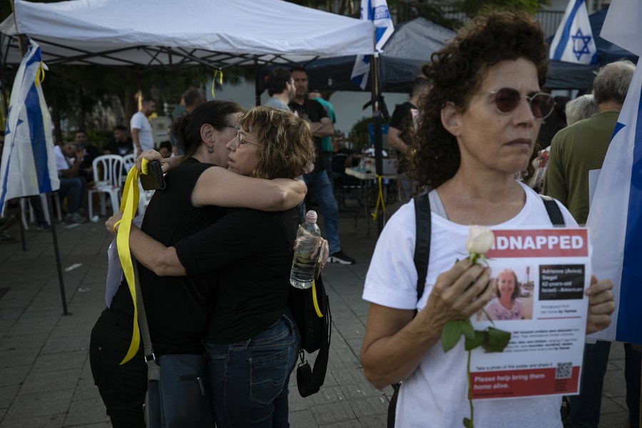 A woman holds a poster showing information of Israeli captives in Tel Aviv, Israel, on Oct. 17, 2023. (Photo by Chen Junqing/Xinhua)