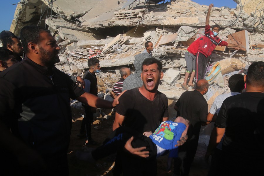 People conduct rescue work after Israeli airstrikes in the southern Gaza Strip city of Khan Younis, Oct. 19, 2023. (Photo by Khaled Omar/Xinhua)