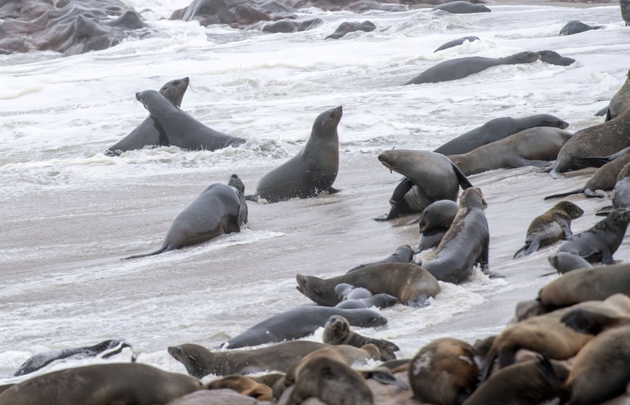 Cape fur seals are pictured in the Cape Cross Seal Reserve, Namibia, Oct. 11, 2023. (Xinhua/Chen Cheng)