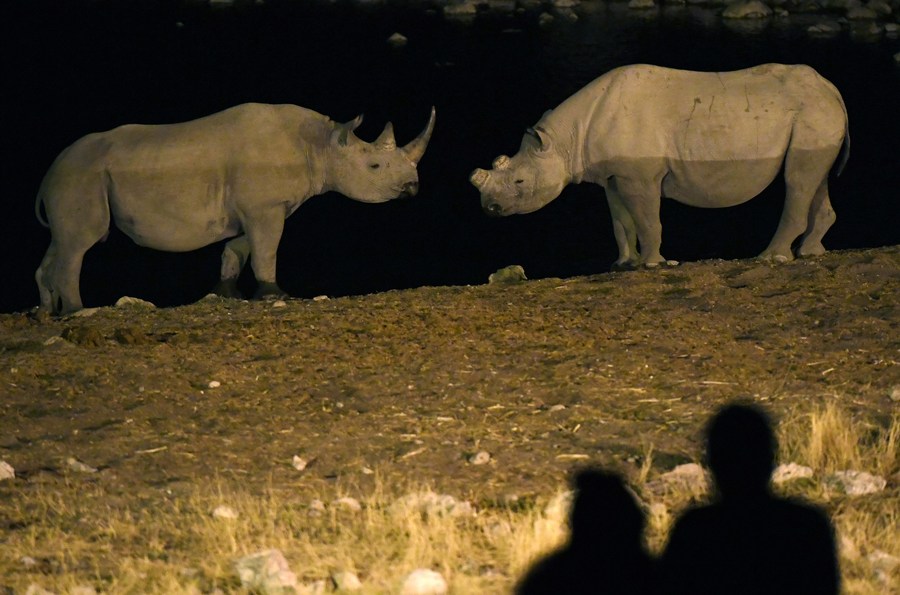 This photo taken on Aug. 14, 2022, shows rhinoceroses at the Etosha National Park in Namibia. (Xinhua/Chen Cheng)