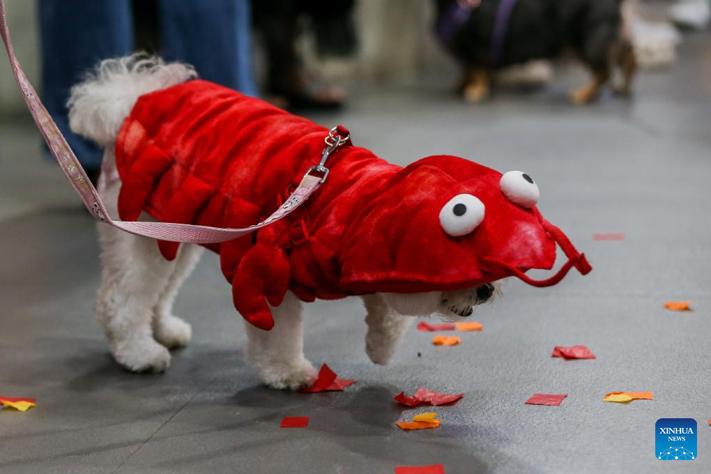 A pet dog dressed in lobster-themed costume is seen during a costume contest for pet dogs in Quezon City, the Philippines on Oct. 22, 2023. (Xinhua/Rouelle Umali)