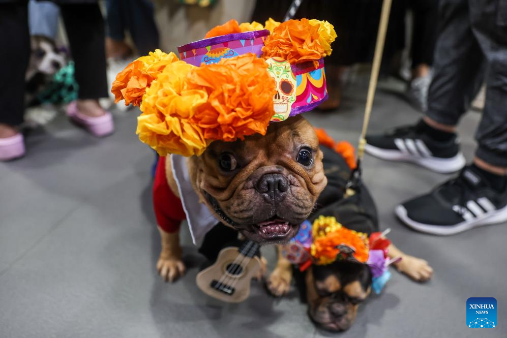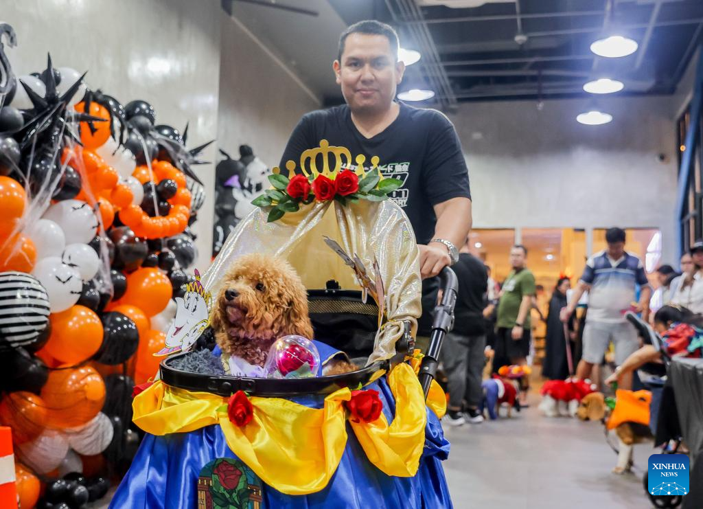 A pet dog is seen during a costume contest for pet dogs in Quezon City, the Philippines on Oct. 22, 2023. (Xinhua/Rouelle Umali)