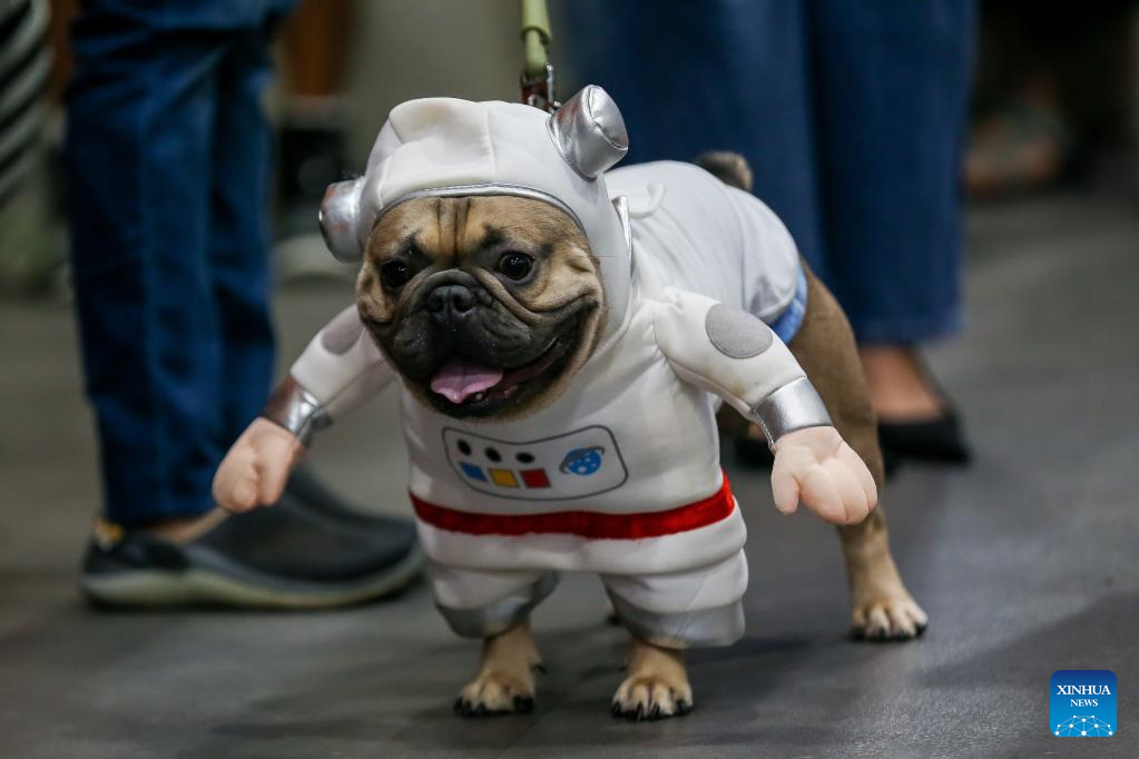 A pet dog dressed in astronaut-themed costume is seen during a costume contest for pet dogs in Quezon City, the Philippines on Oct. 22, 2023. (Xinhua/Rouelle Umali)
