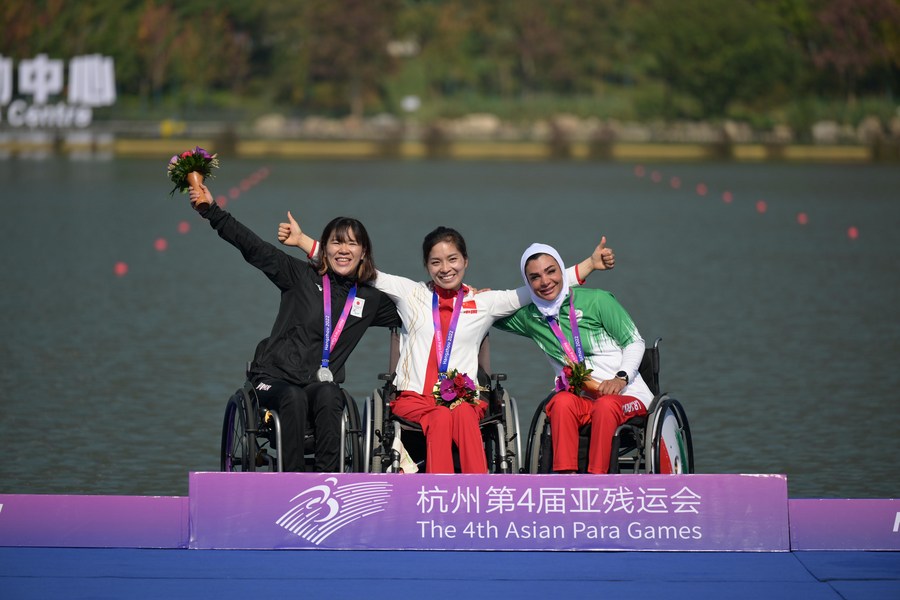 Gold medalist Xie Maosan (C) of China, silver medalist Monika Seryu (L) of Japan and bronze medalist Sara Abdolmaleki of Iran attend the award ceremony for the women's KL1 at the 4th Asian Para Games in Hangzhou, east China's Zhejiang Province, Oct. 23, 2023. (Xinhua/Li He)